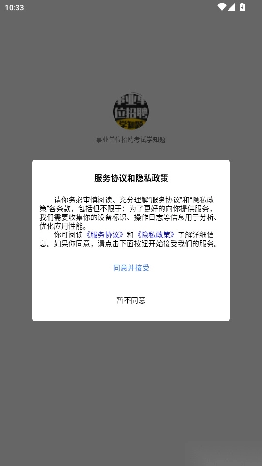 打開軟件后,閱讀“服務(wù)協(xié)議和隱私政策”,點(diǎn)擊“同意并接受”按鈕即可進(jìn)入。