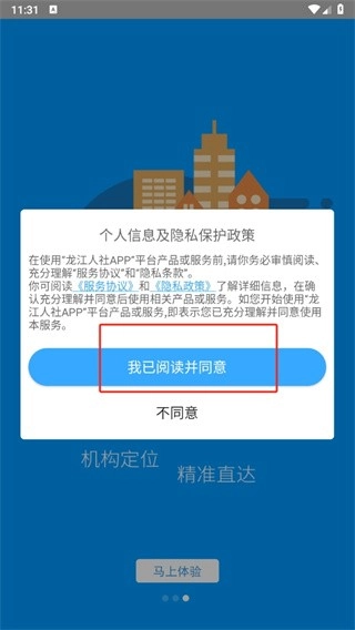 首先啟動龍江人社應(yīng)用程序,啟動完成后點(diǎn)擊界面上的【馬上體驗(yàn)】按鈕。