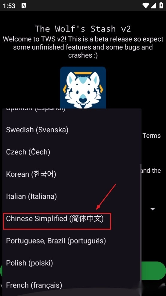 點擊“Language”選項后,會彈出一個語言列表。在該列表里,找到并選擇“Chinese Simplified”(簡體中文)來作為你的應(yīng)用語言。