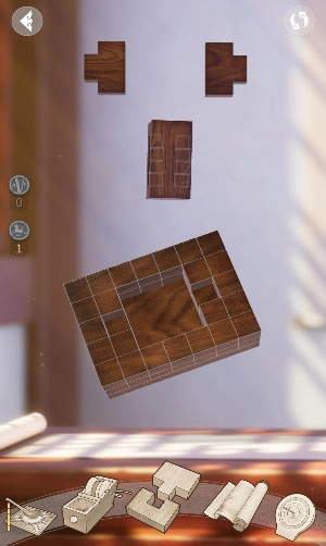 搭建榫卯結(jié)構(gòu)的核心在于玩家通過(guò)細(xì)致巧妙的加工,讓各個(gè)結(jié)構(gòu)之間緊密嵌合,實(shí)現(xiàn)“嚴(yán)絲合縫”的理想狀態(tài)。拿第一關(guān)來(lái)說(shuō),界面里的“榫”和“卯”結(jié)構(gòu)分別處于屏幕上下兩側(cè),只要點(diǎn)擊屏幕上方的部件,兩者就會(huì)互換位置;而在空白區(qū)域滑動(dòng)手指,就能轉(zhuǎn)動(dòng)屏幕中間的構(gòu)件。