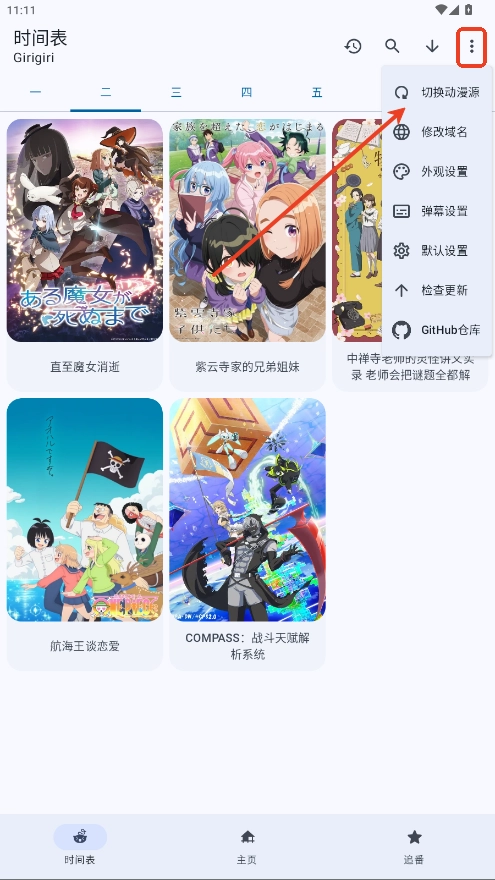 在時間表右上角有放大鏡按鈕可以搜素你喜歡的動漫片。