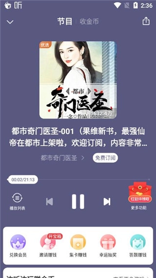 極速版的核心亮點在于“聽書賺收益”,用戶能夠借助收聽節(jié)目、每日簽到、邀請好友等方式獲取金幣,這些金幣既可以用來提現(xiàn),也能兌換各類獎品,非常適合那些想在聽書的同時還能獲得收益的用戶群體。