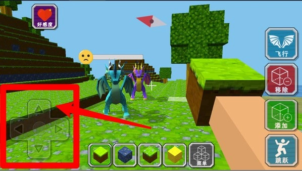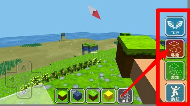 右側功能鍵說明如下:飛行功能,點擊該鍵即可進入飛行模式;移除功能,點擊對應方塊就能將其刪除;添加功能,可把方塊放置到目標位置;跳躍功能,觸發(fā)后可執(zhí)行跳躍動作。