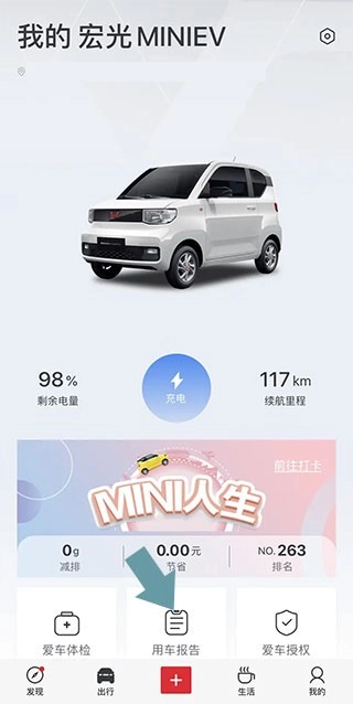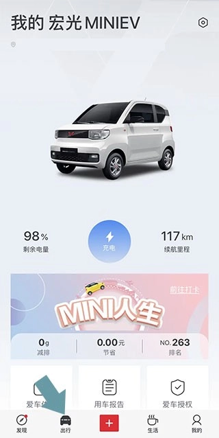 若需查看電量,需先綁定車輛,之后在主頁面點擊“出行”選項。