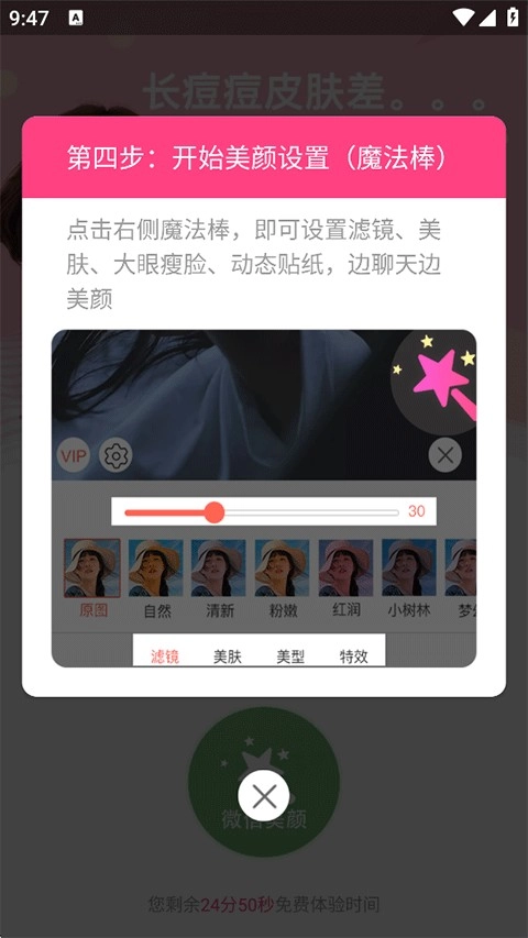 點擊右側的魔法棒圖標,就能設置美顏、濾鏡、美膚等各類效果,讓你在聊天的同時同步開啟美顏功能。
