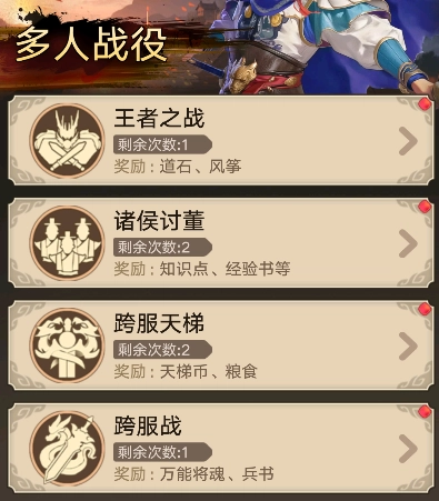 多人戰(zhàn)役的玩法涵蓋【跨服天梯】【跨服戰(zhàn)】【王者之戰(zhàn)】【諸侯討董】【烏巢押運】這些內(nèi)容。玩家參與這些相關(guān)玩法,就能獲取對應(yīng)的游戲資源材料。
