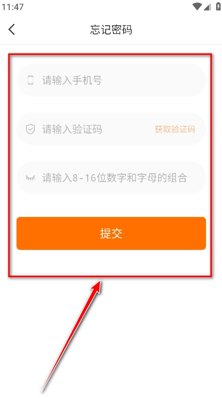 請(qǐng)輸入手機(jī)號(hào)、驗(yàn)證碼、新密碼,點(diǎn)擊提交即可。