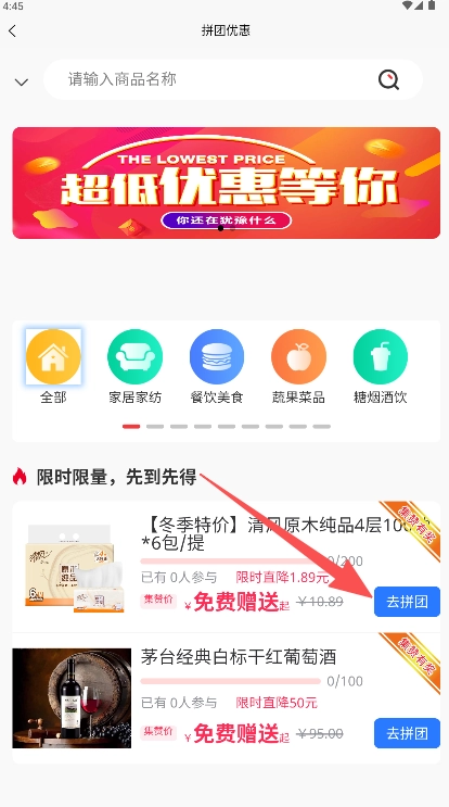 在拼團優(yōu)惠頁面瀏覽商品列表,找到想要的商品后,點擊該商品右側的“去拼團”按鈕。