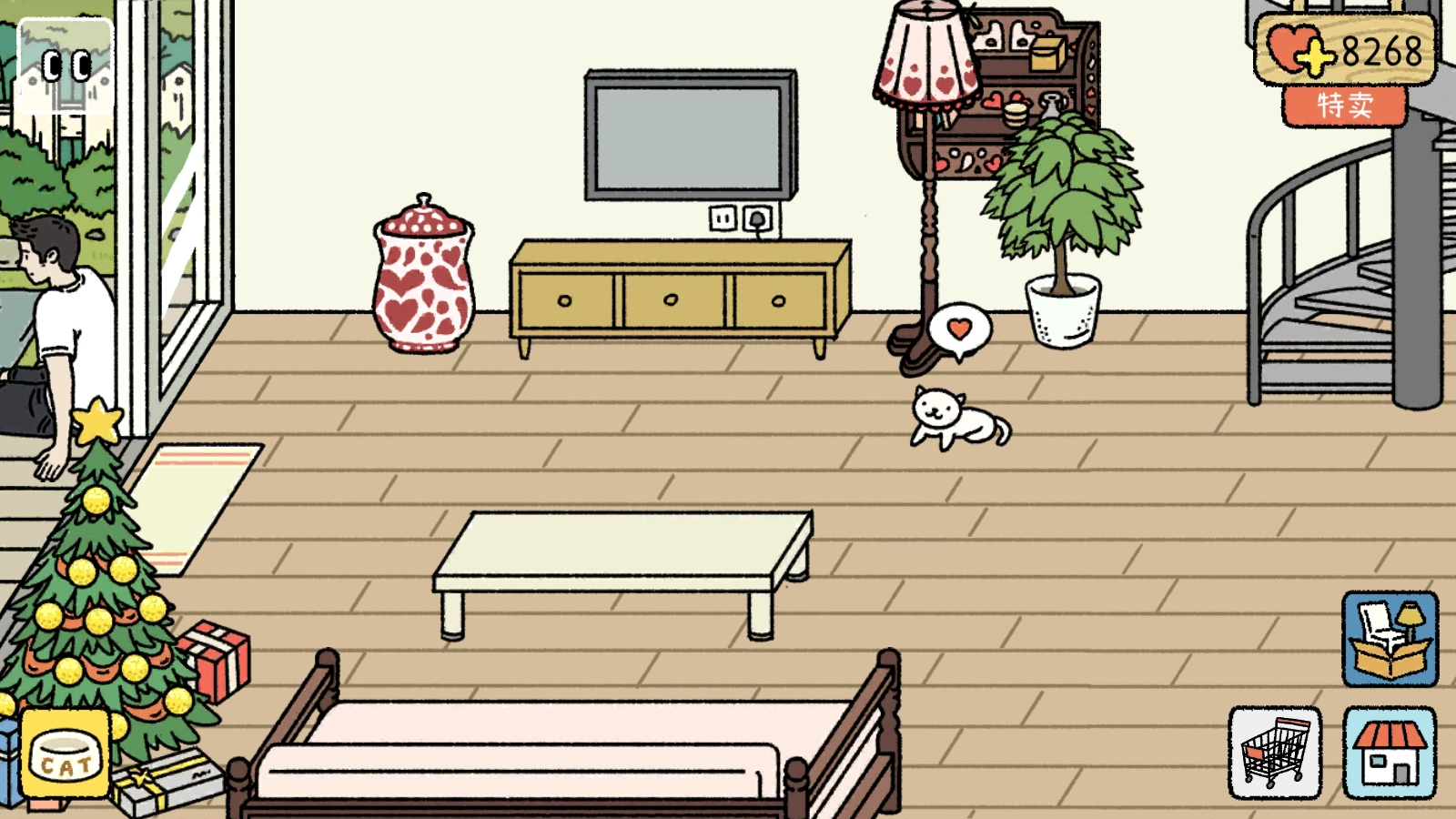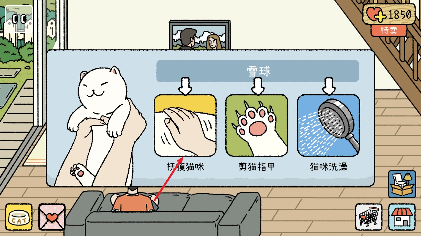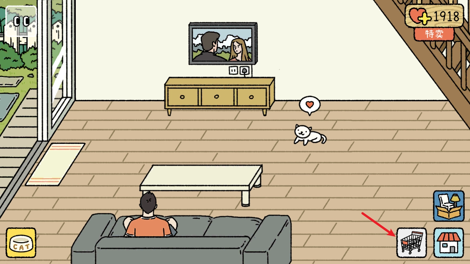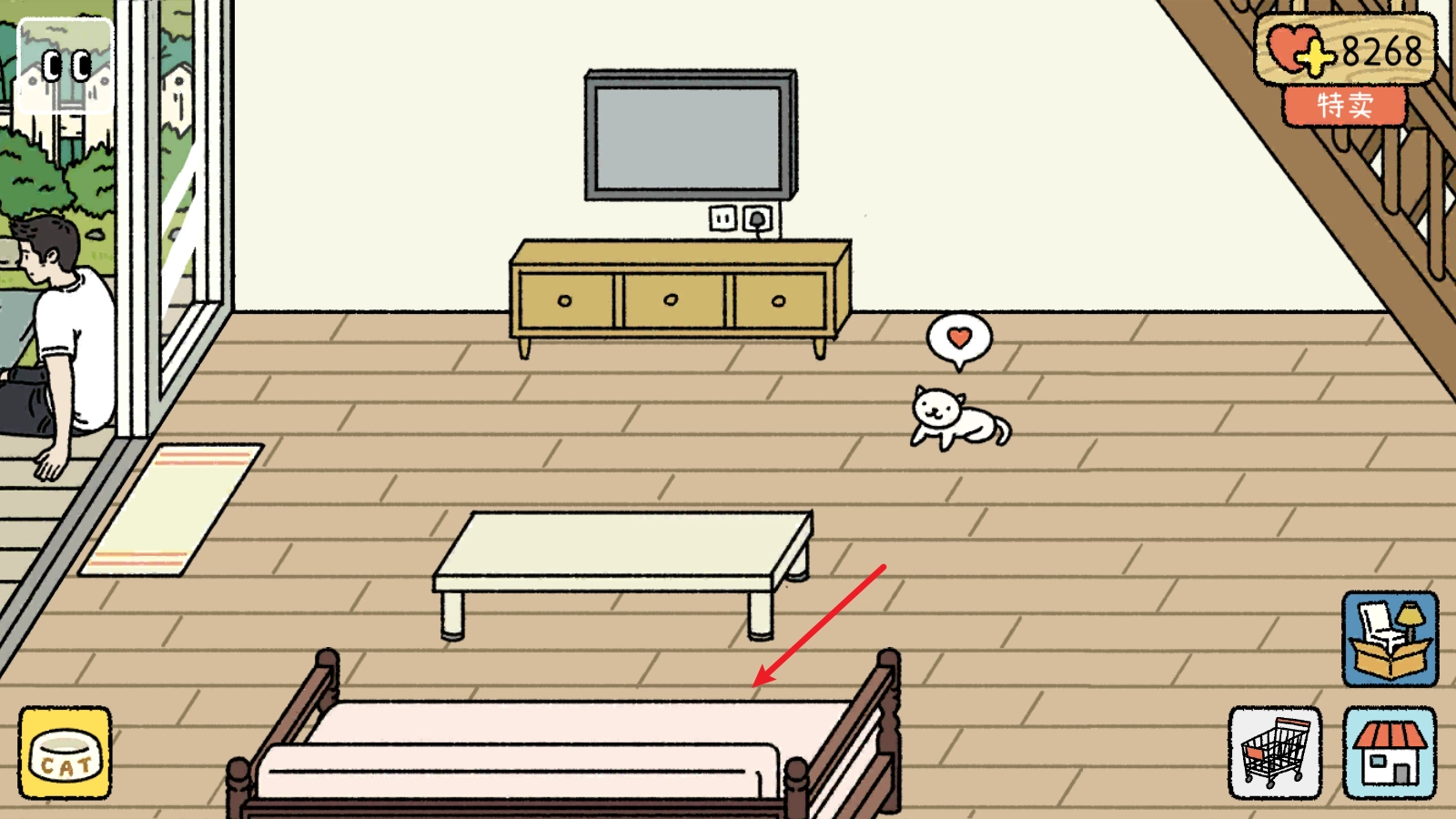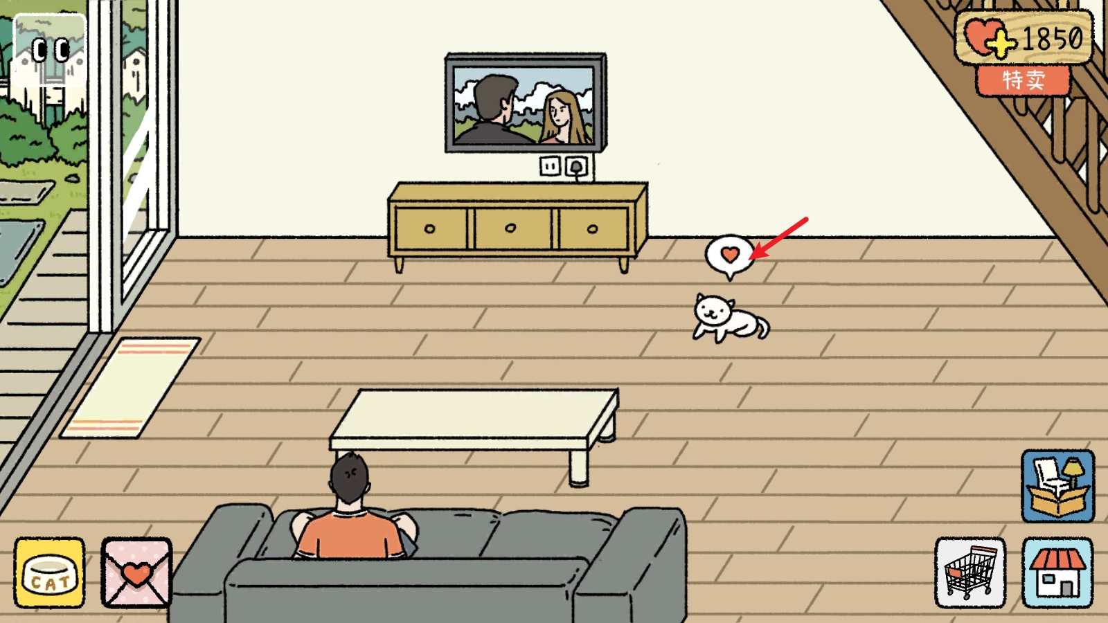 進(jìn)入游戲后,溫馨的日常生活便會開啟,我們可以看看電視、逗逗貓咪,還能點擊貓咪頭頂?shù)膼坌摹?/p>