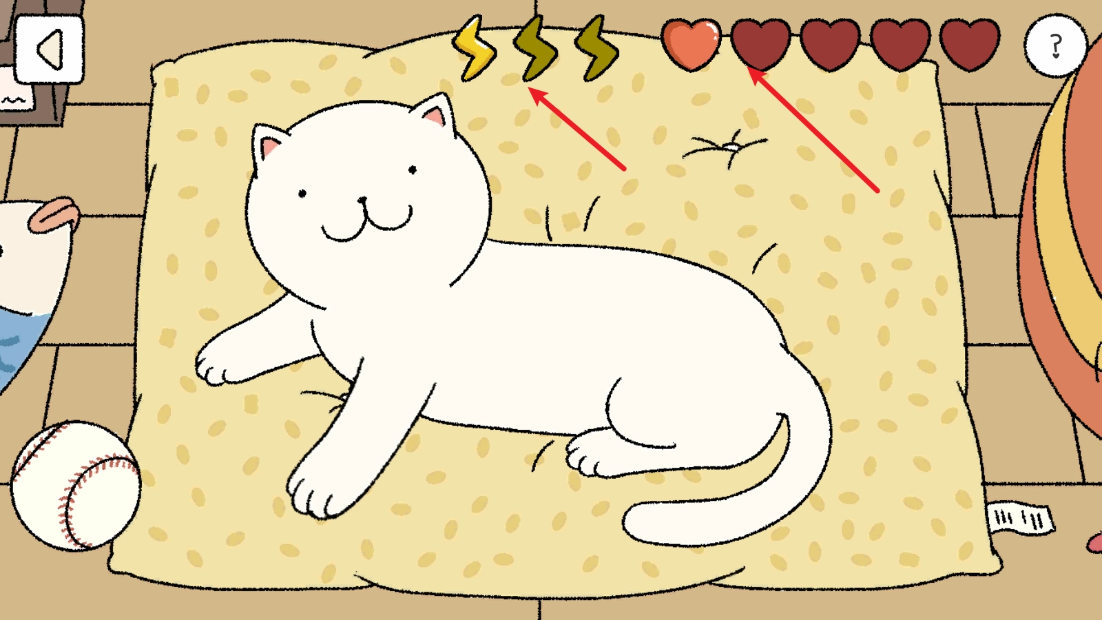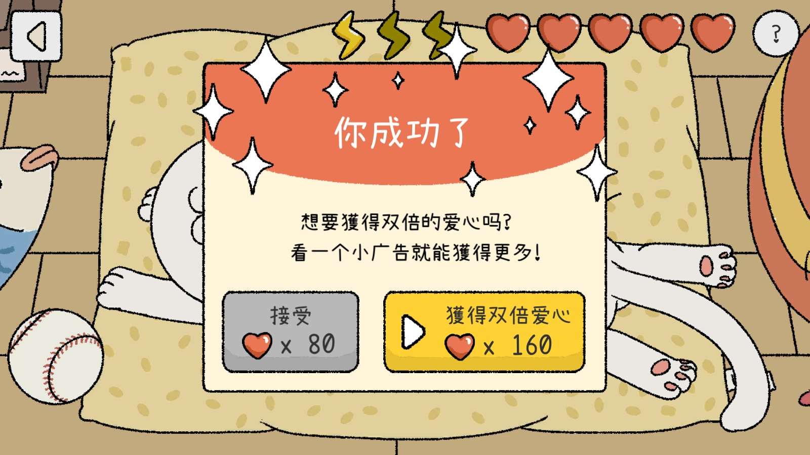 我們可以點擊貓咪的身體來逗弄它,點擊它喜歡的部位就能收集到愛心,要是點到它不喜歡的地方則會得到閃電,無論是愛心還是閃電,只要其中一種積攢滿了,這次逗貓互動就會結(jié)束。