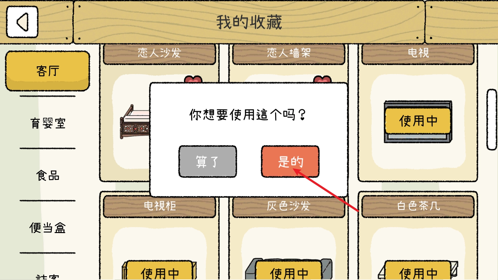 接著返回房間,點擊右下角的藍(lán)色圖標(biāo)進(jìn)入個人藏品界面,選中要擺放的家具,然后點擊“是的”確認(rèn)。