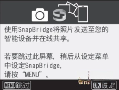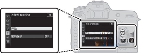 在相機(jī)的設(shè)置菜單里找到“連接至智能設(shè)備”選項(xiàng),選中后點(diǎn)擊“開(kāi)始”按鈕,再按下OK鍵確認(rèn)操作。