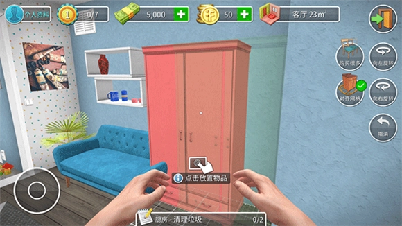 之后你可以對房間里的物品進行布置,拖動就能調(diào)整物品的位置,也可以進行旋轉(zhuǎn)之類的操作;