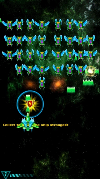 這里有三波敵人,第一波難度最低,玩家在摧毀敵方飛船后還能收集到強化道具。