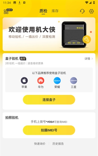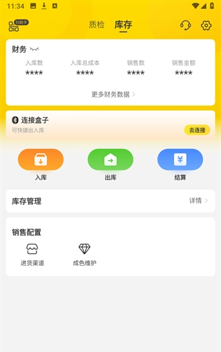 3、登錄成功之后進(jìn)入首頁,有質(zhì)檢和庫存兩個(gè)板塊,質(zhì)檢可以進(jìn)行盒子驗(yàn)機(jī)和拍照驗(yàn)機(jī)。