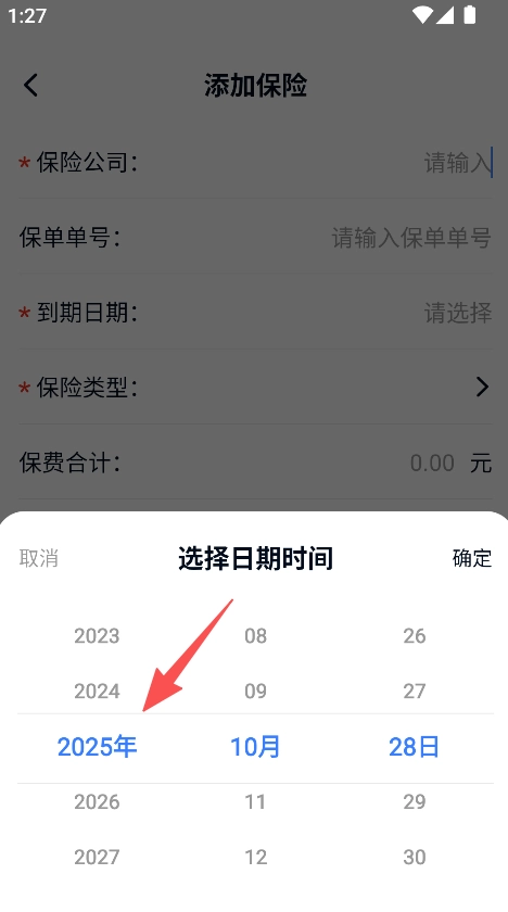 添加保險(xiǎn)時(shí),請(qǐng)選擇到期日期,并根據(jù)自身需求選取對(duì)應(yīng)的年份、月份和日期。
