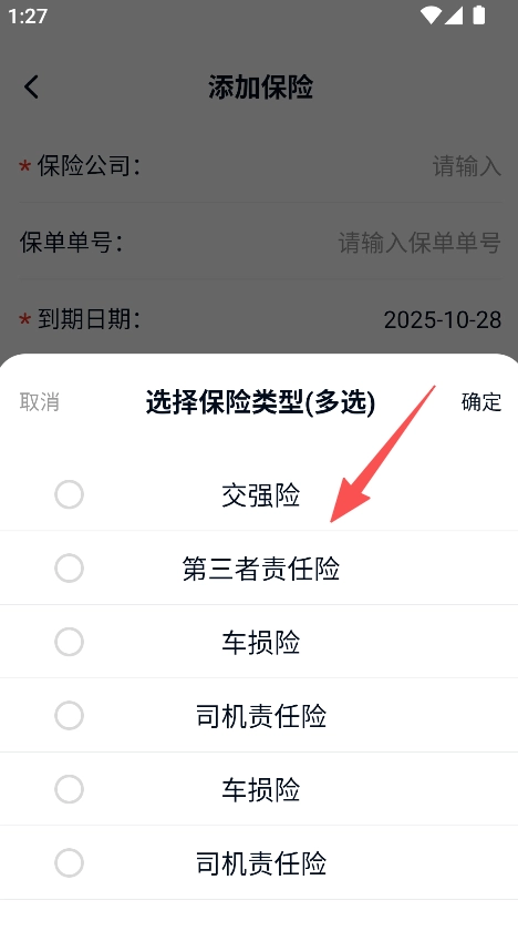 具備保險(xiǎn)險(xiǎn)種選擇功能,支持第三者責(zé)任險(xiǎn)等多種險(xiǎn)種的多選操作,能夠精準(zhǔn)記錄各項(xiàng)保險(xiǎn)的保障范圍。