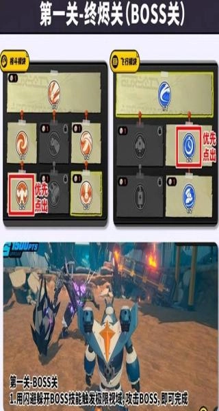 第一關(guān)-BOSS關(guān)卡(終燼關(guān)卡):格斗模塊優(yōu)先解鎖框選技能,飛行模塊優(yōu)先選擇標(biāo)紅技能;戰(zhàn)斗過(guò)程中通過(guò)閃避避開(kāi)BOSS技能以觸發(fā)極限視域,持續(xù)攻擊BOSS便能完成通關(guān)。