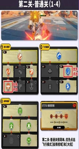 第二關(guān)-普通關(guān)(1-4):格斗模塊優(yōu)先選擇紅框標(biāo)注的技能加點(diǎn),飛行模塊則優(yōu)先升級(jí)標(biāo)紅的【極限視域】技能和大招;由于關(guān)卡難度較低,建議優(yōu)先點(diǎn)出這些關(guān)鍵技能來(lái)推進(jìn)關(guān)卡進(jìn)度。
