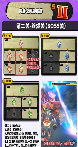 第一關(guān)的BOSS戰(zhàn)打法如下:格斗模塊需點(diǎn)擊左下方紅框內(nèi)的技能(該技能已升至2級(jí)),飛行模塊則要點(diǎn)擊右側(cè)的【極限視域】技能(同樣是2級(jí));戰(zhàn)斗中通過(guò)閃避躲避BOSS技能來(lái)觸發(fā)極限視域效果,之后進(jìn)行蓄力輸出即可。