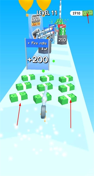 在第11關(guān)里操控武器獲取射速增益和金幣道具,提升武器攻擊速度的同時(shí)積攢資源,為之后的關(guān)卡挑戰(zhàn)打下基礎(chǔ)。