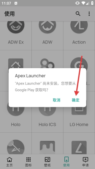 若所選啟動器尚未安裝,系統(tǒng)會彈出提示窗口詢問是否從GooglePlay獲??;點擊【確定】可跳轉至獲取安裝頁面,點擊【取消】則終止操作。待對應啟動器安裝完成后,就能應用該圖標包了。