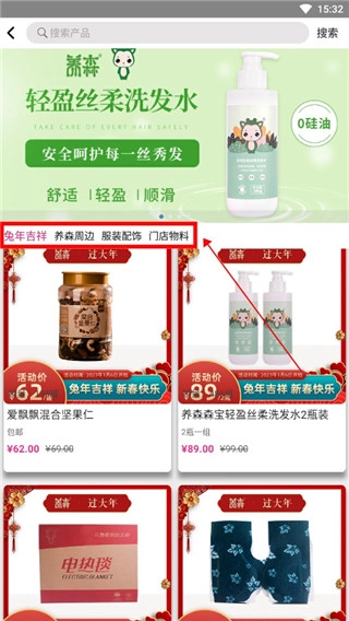 進(jìn)入購物頁面后,能看到新年新品、養(yǎng)森周邊、服裝配飾、門店物料等分類板塊;用戶既可以通過搜索框直接搜索想要的產(chǎn)品,也能通過下拉選擇的方式找到所需商品。