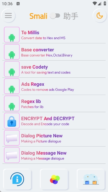 Smali助手是開發(fā)者推出的一款聚焦安卓系統(tǒng)的實(shí)用工具,核心目標(biāo)是“簡(jiǎn)化高級(jí)玩機(jī)操作”,整合了反編譯、代碼修改、保護(hù)、功能優(yōu)化等功能,為安卓搞機(jī)愛好者、開發(fā)者和普通用戶提供一站式工具服務(wù)方案。并且全程免費(fèi)且,依靠“傻瓜化操作+專業(yè)級(jí)功能”的特點(diǎn),成為手機(jī)折騰愛好者的必備工具。