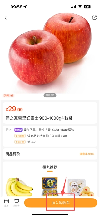 在蘋果梨蕉的商品列表頁面,挑選潤之家雪里紅富士900-1000g4粒裝這款商品,然后進入該商品的詳情頁面。