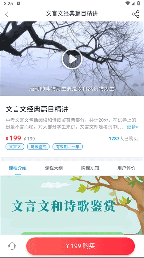 點(diǎn)擊具體課程后,若系統(tǒng)提示需要購(gòu)買該課程,可點(diǎn)擊頁(yè)面上的購(gòu)買按鈕進(jìn)入支付界面。
