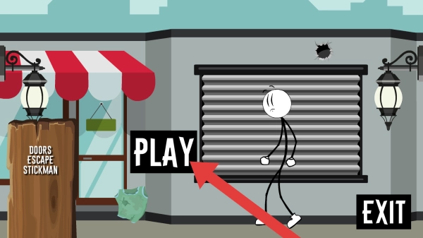 畫面進(jìn)入場景選擇環(huán)節(jié),【PLAY】按鈕用于啟動(dòng)游戲,“EXIT”則是退出選項(xiàng),火柴人角色與建筑等元素共同組成初始畫面,這是動(dòng)作解謎類火柴人逃生冒險(xiǎn)游戲的典型開局模式。