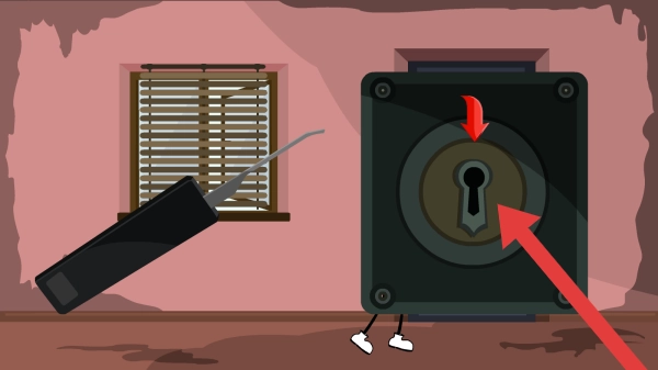 呈現(xiàn)火柴人借助開鎖工具嘗試打開帶鎖孔保險(xiǎn)箱的解謎場景,這是常見的開鎖解謎關(guān)卡環(huán)節(jié),通過火柴人形象結(jié)合密室逃脫與道具解謎的玩法,推動(dòng)玩家解鎖逃生流程。