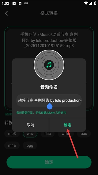 當(dāng)音頻命名窗口彈出后,確認(rèn)好音頻的名稱,接著點(diǎn)擊“確定”按鈕,這樣就能完成音頻格式的轉(zhuǎn)換了。