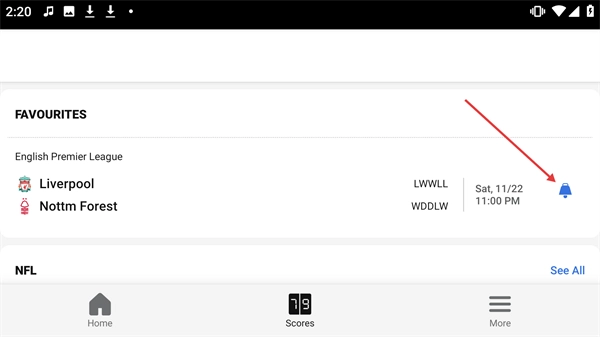 在你關注的聯賽(比如英超)和球隊(比如利物浦)旁邊,點擊鈴鐺形狀的圖標就能設置比賽提醒,這樣就能及時收到比賽時間的通知了。