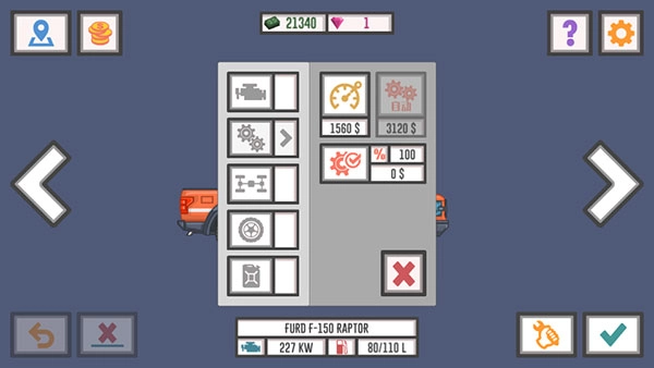 在改裝界面里能分別調(diào)節(jié)引擎輸出、輪胎類型、懸掛硬度、燃油系統(tǒng)等核心部件,即時查看性能變動。