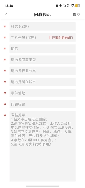 請輸入您的聯(lián)系方式,并選擇是否將其公開。在勾選留言須知后點擊提交按鈕,系統(tǒng)會自動生成對應(yīng)的投訴工單編號。
