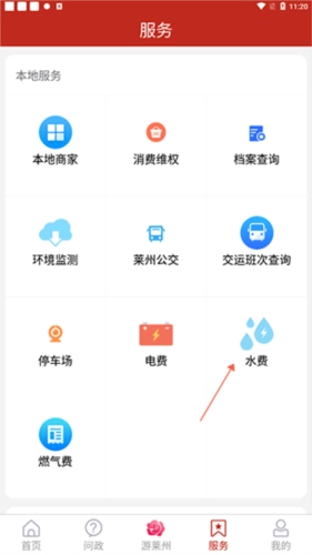 打開萊州融媒軟件之后,點(diǎn)擊服務(wù)界面,選擇水費(fèi)。
