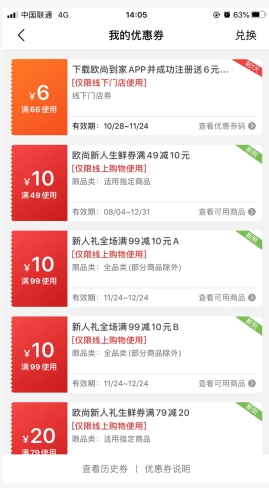 在我的界面,點(diǎn)擊優(yōu)惠券就能看到我們已有的優(yōu)惠券了