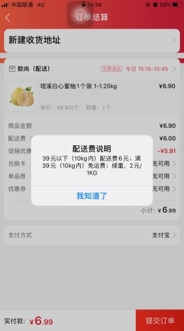 39元以下(10kg內(nèi))配送費(fèi)6元;滿39元(10kg內(nèi))免運(yùn)費(fèi);續(xù)重,2元/1KG