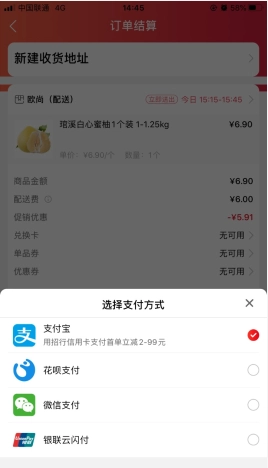 目前我們可以看到有支付寶、花唄、微信以及銀聯(lián)云閃付這四種方式。
