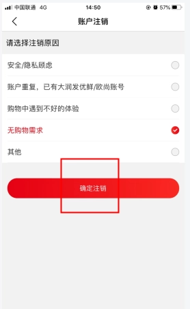 請(qǐng)先選擇您的注銷原因,點(diǎn)擊“確定注銷”按鈕后,就能完成賬號(hào)注銷流程啦!
